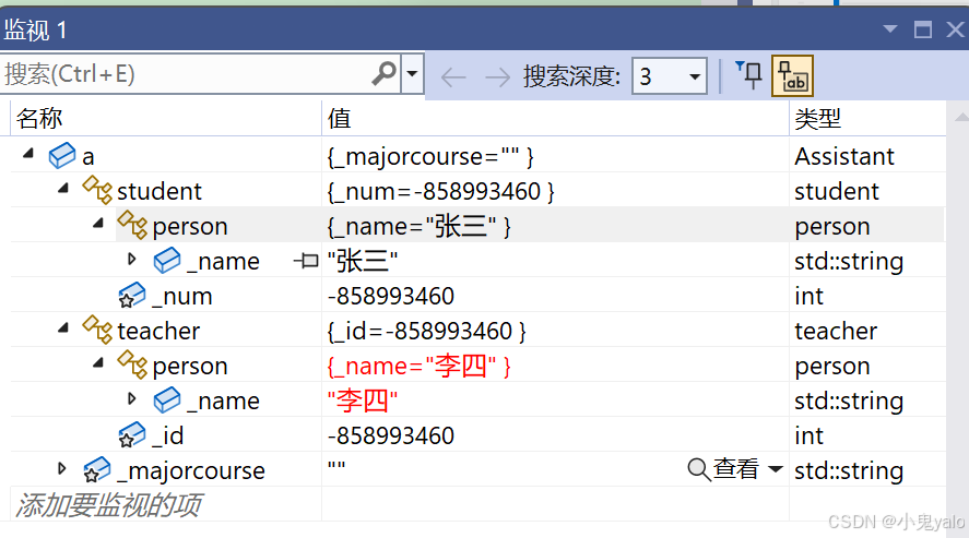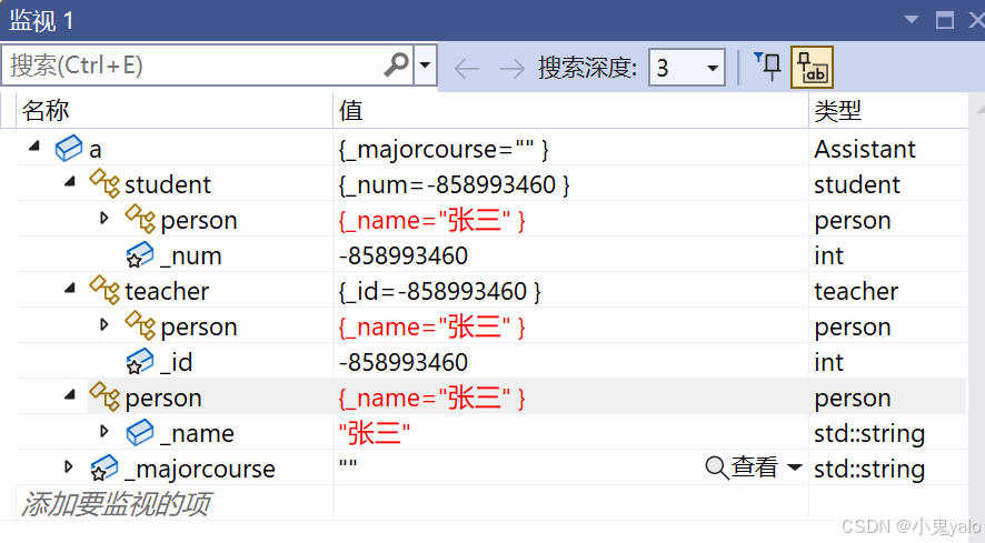 通过监视窗口可以看出,对象a中包含了两份person的信息。