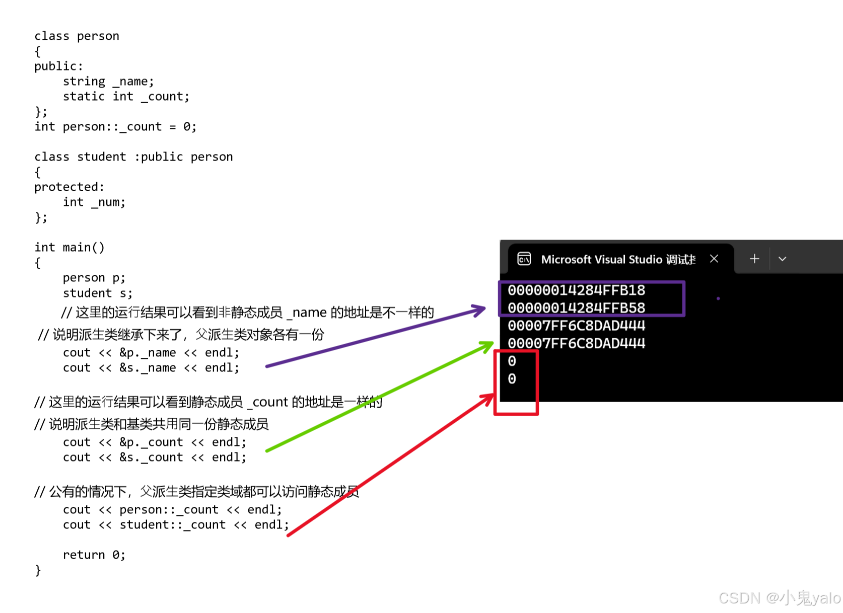 基类中定义了static静态成员变量,则整个继承体系中只有一个这样的成员。无论派生出多少派生类,都只有一个static成员实例。