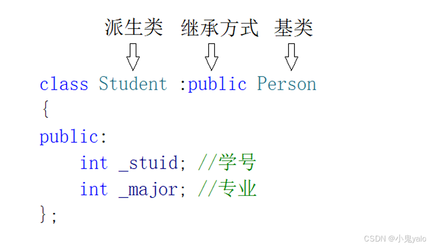 class person { public: void identity() { //... } protected: string _name = "张三"; string adderss; //地址 string _tel; //电话 int _age = 18; //年龄 }; class student :public person { public: void identity() { //... } void study() { cout << " void study()" << endl; } protected: int _id; //学号 }; class teacher: public person { public: void teaching() { cout << "teaching" << endl; } protected: string _title; //职称 };