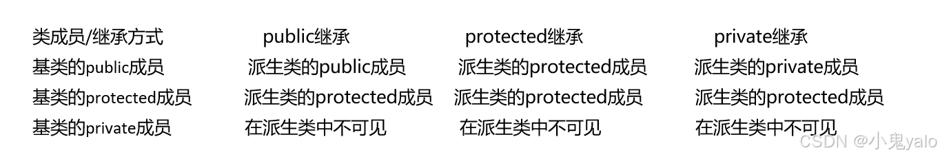 3,实际上⾯的表格我们进⾏⼀下总结会发现,基类的私有成员在派⽣类都是不可见。基类的其他成员 在派⽣类的访问⽅式==Min(成员在基类的访问限定符,继承方式),public >protected> private。