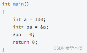 上⾯代码中就使⽤了解引⽤操作符, *pa 的意思就是通过pa中存放的地址,找到指向的空间,*pa其实就是a变量了;所以*pa = 0,这个操作符是把a改成了0。