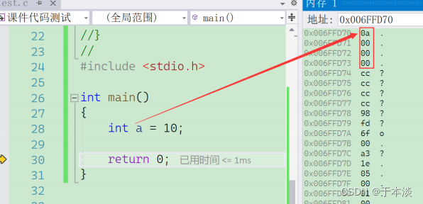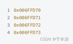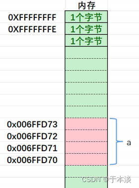 ⽐如,上述的代码就是创建了整型变量a,内存中申请4个字节,⽤于存放整数10,其中每个字节都有地址,上图中4个字节的地址分别是: