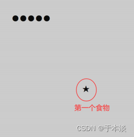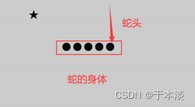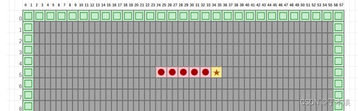 初始化状态,假设蛇的⻓度是5,蛇⾝的每个节点是●,在固定的⼀个坐标处,⽐如(24, 5)处开始出现蛇,连续5个节点。 注意:蛇的每个节点的x坐标必须是2个倍数,否则可能会出现蛇的⼀个节点有⼀半⼉出现在墙体中,另外⼀般在墙外的现象,坐标不好对⻬。 关于⻝物,就是在墙体内随机⽣成⼀个坐标(x坐标必须是2的倍数),坐标不能和蛇的⾝体重合,然后打印★。