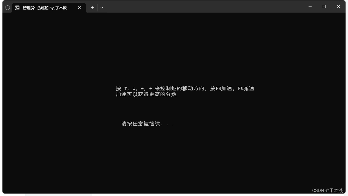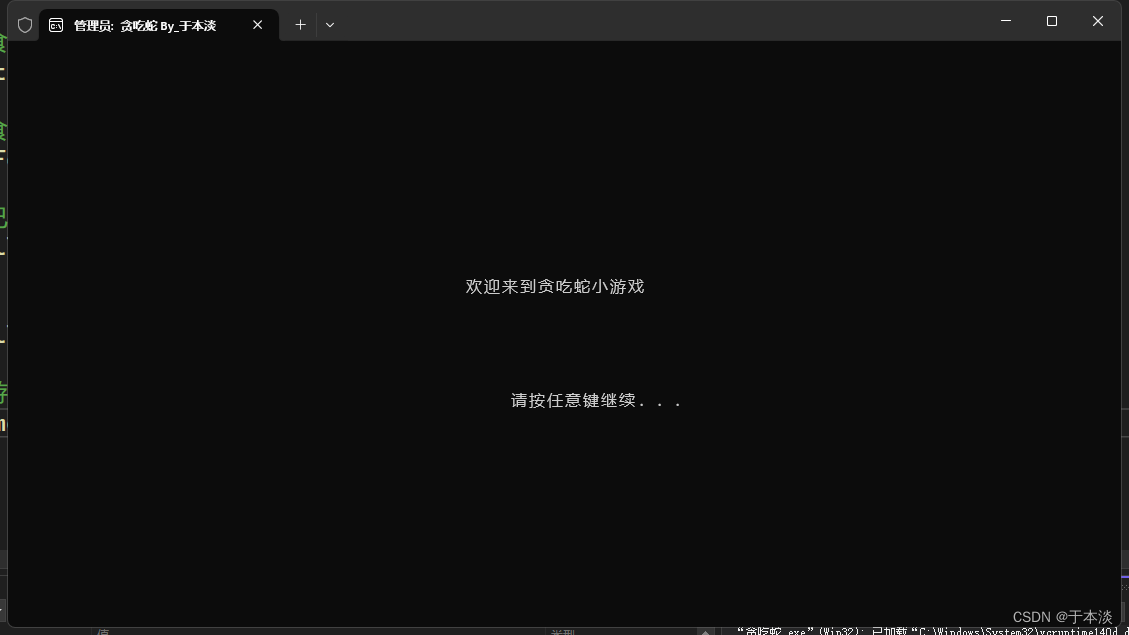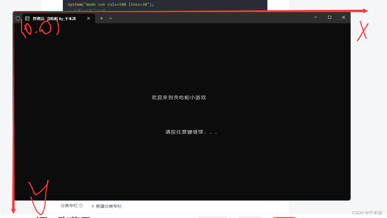 我们可以使⽤cmd命令来设置控制台窗⼝的⻓宽和名字:设置控制台窗⼝的⼤⼩,30⾏,100列。设置名字为贪吃蛇。