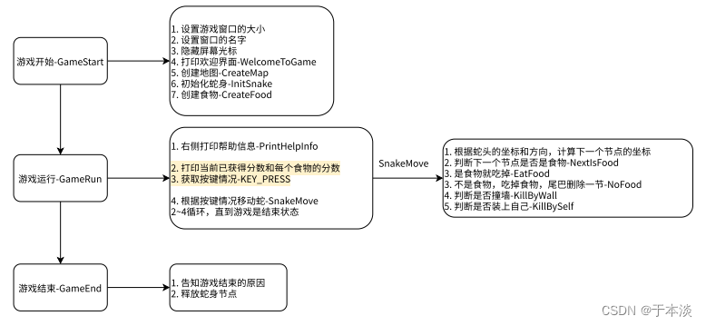 }游戏状态不再是OK(游戏继续)的时候,要告知游戏结束的原因,并且释放蛇⾝节点。