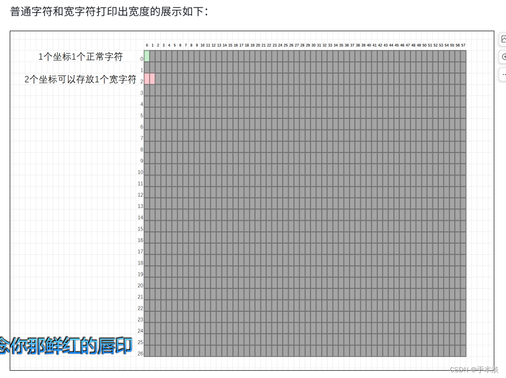 那如果想在屏幕上打印宽字符,怎么打印呢? 宽字符的字⾯量必须加上前缀“L”,否则 C 语⾔会把字⾯量当作窄字符类型处理。 前缀“L”在单引号前⾯,表⽰宽字符,对应 wprintf() 的占位符为 %lc ;在双引号前⾯,表⽰宽字符串,对应 wprintf() 的占位符为 %ls 。