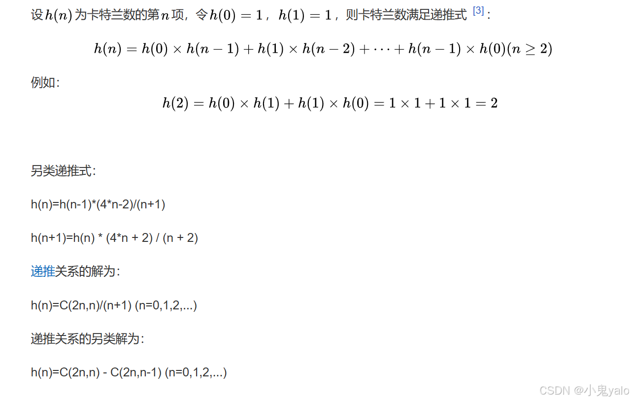 卡特兰数的递推公式为:f(n) = f(0) * f(n - 1) + f(1) * f(n - 2) + ... + f(n - 1) * f(0),其中初始值f(0) = f(1) = 1。