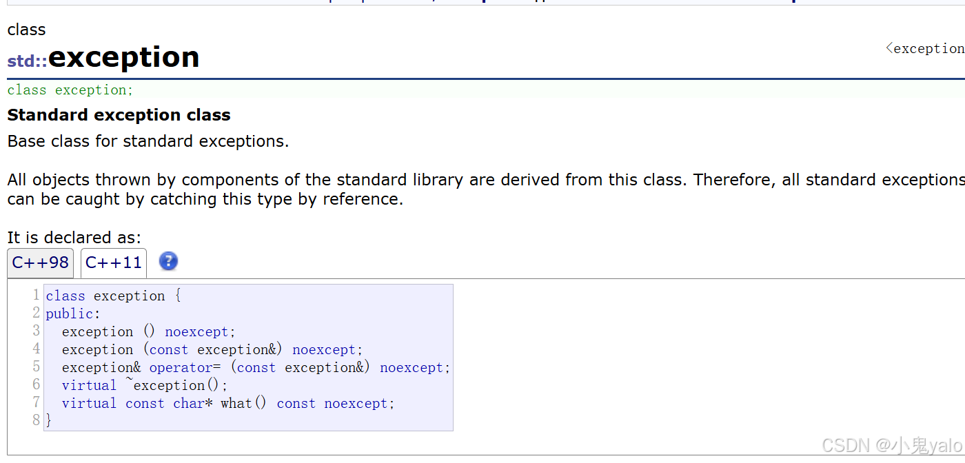 C++标准库定义了一套自己的异常体系,基类是exception,所以我们在捕获异常时,捕获exception即可,要获取异常信息,调用what()函数,what()是一个虚函数,派生类可以重写。