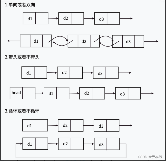 1. ⽆头单向⾮循环链表:结构简单,⼀般不会单独⽤来存数据。实际中更多是作为其他数据结构的⼦结构,如哈希桶、图的邻接表等等。另外这种结构在笔试⾯试中出现很多。