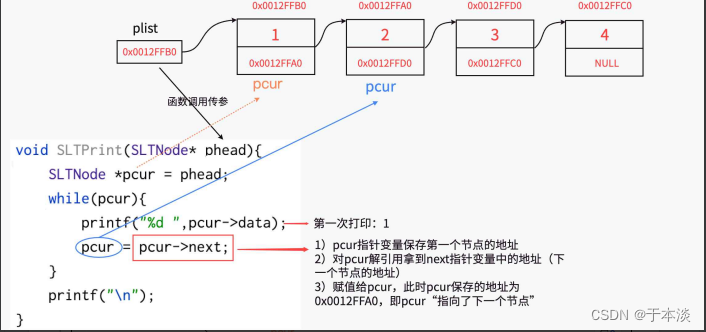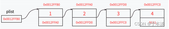 图中指针变量 plist保存的是第⼀个节点的地址,我们称plist此时“指向”第⼀个节点,如果我们希望plist“指向”第⼆个节点时,只需要修改plist保存的内容为0x0012FFA0。