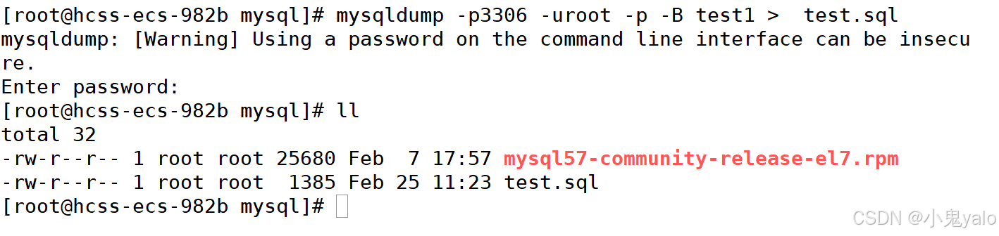 这里我们对数据库进行备份,备份文件test.sql中,其实会把 整个创建数据库,建表,导入数据的语句都装载到这个文件。