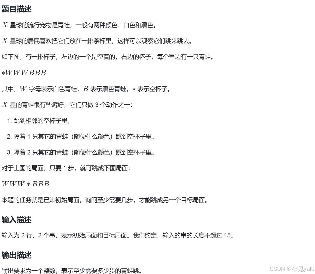 对于初始字符串st_str,求最少步数变成目标字符串end_str。题目中说的是青蛙可以进行的操作,其实也就是空杯子的操作,我们让青蛙保持不动,尝试移动空杯子,变成 目标的字符串。 而对于空杯子,可以进行的操作有6步[-3,-2,-1,1,2,3],我们可以用一个map来存储字符串str和它对应的操作次数。从初始字符串开始,每次经过一步,得到一个新字符串str,如果该字符串在map中不存在,那么就插入该字串,如果存在就跳过。然后判断变化后的字符串和目标字符串end_str是否相等,如果相等,直接返回map[str]即可。 具体细节看下面代码: