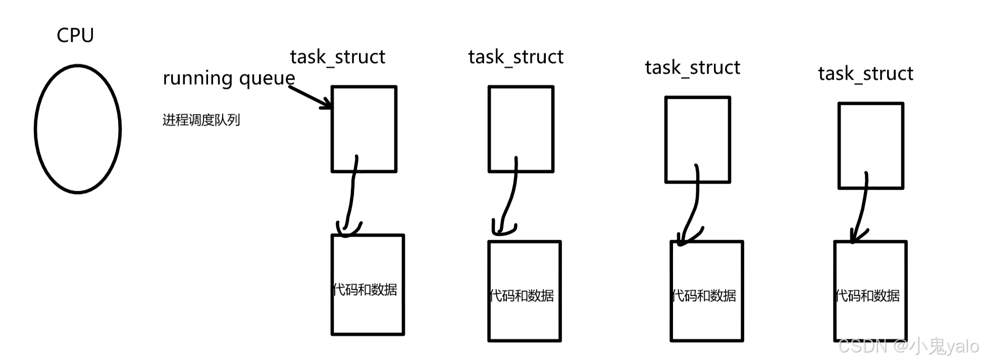 操作系统中会存在多个进程。每个进程可能会存在不同的状态,有的进程正在运行,有的进程正在被调度,有的进程处于挂起等等。CPU要执行这些进程,这些进程的task_struct中会保存指向代码和数据的指针。操作系统会维护一个运行队列(running queue),存放要运行的task_struct,这个队列就叫做调度队列,其中的一个个task_struct就是要被调度的进程。