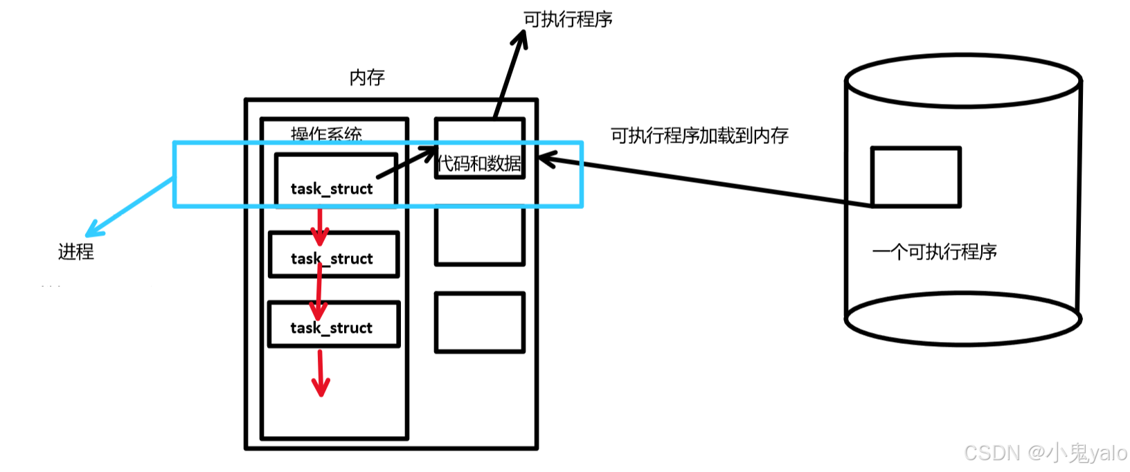 同一时刻,可能会有多个可执行程序被加载到内存,而操作系统要对这些可执行程序进行管理, 在操作系统层面上,就会在内部会建立一个task_stuct 对象,里面保存了该可执行程序的代码地址,数据地址等各种信息。将这些task_struct使用链表或者其他数据结构管理起来,那么操作系统对进程的管理就转化为对链表的管理。