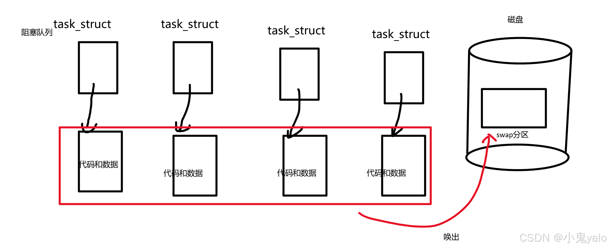 阻塞挂起状态:将阻塞队列中的进程 唤出到磁盘的swap分区上