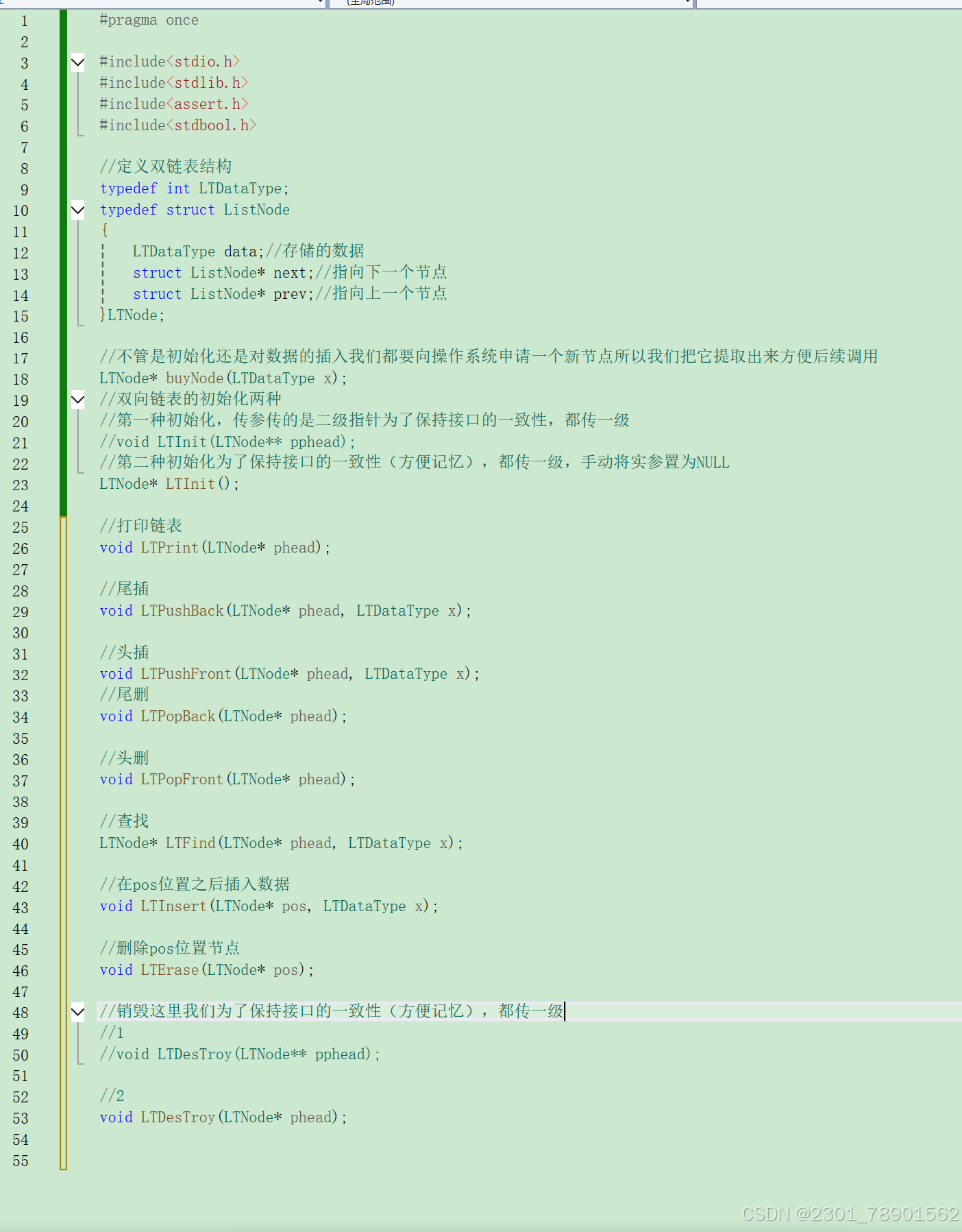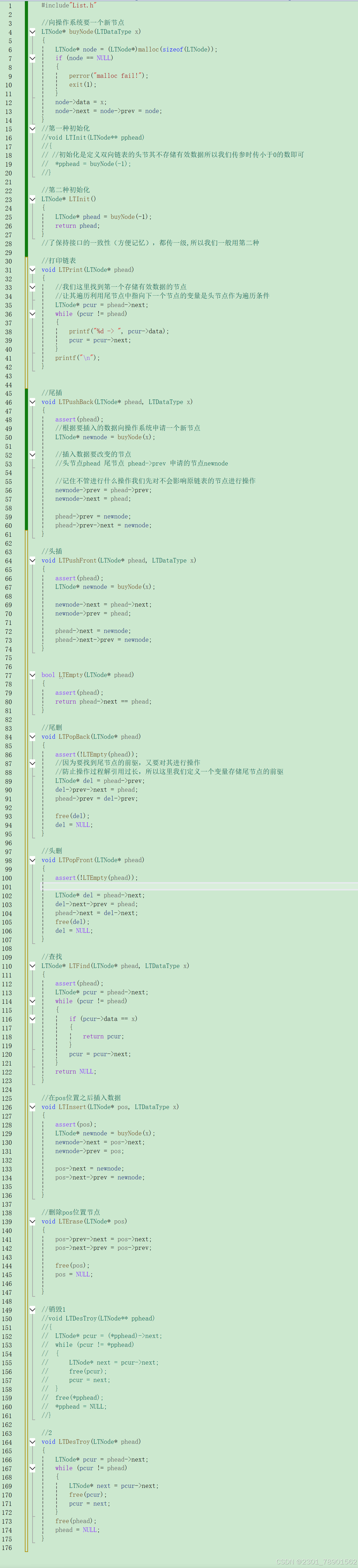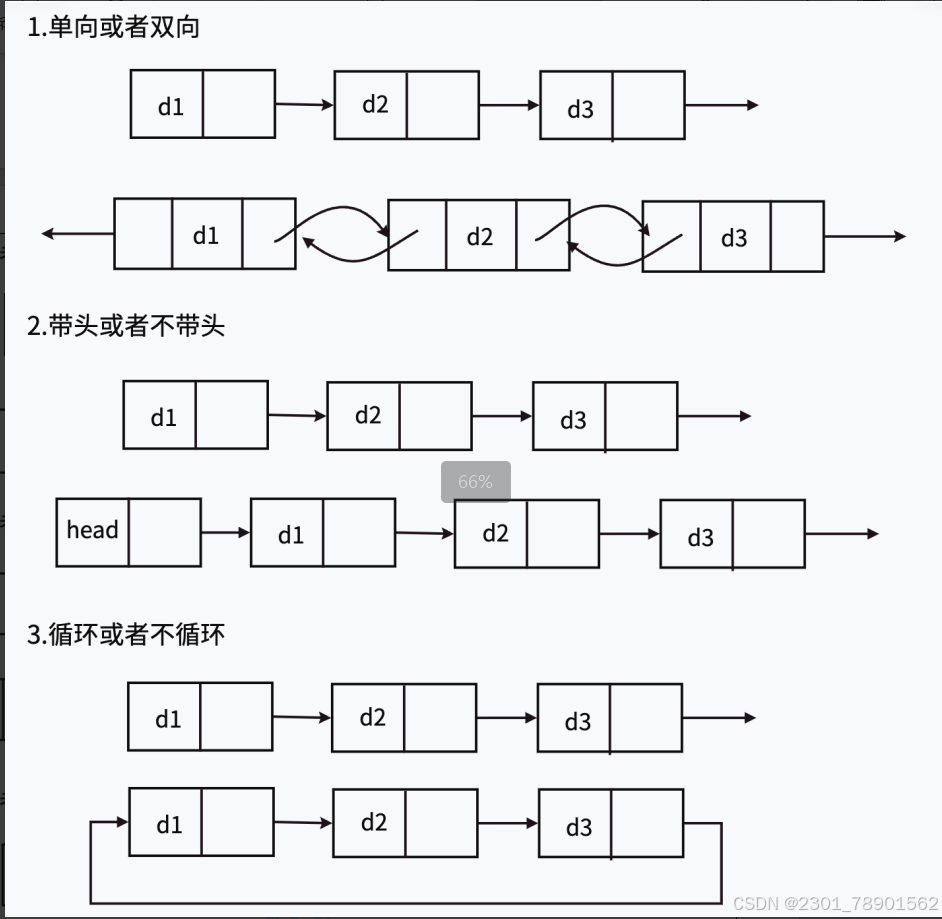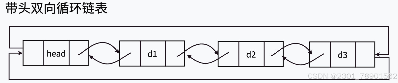 【注意这里的带头不带头是指链表的第一个节点是否为有有效节点即第一个节点是否存储真实数据如我们的单向链表第一个节点就存储真实数据所以单向链表不带头(无头节点我们这里把第一个节点称为头节点只是为了方便理解)而双向链表的第一个节点就没有存储真实数据只是起到哨兵位的作用所以双向链表带头(有头节点)】