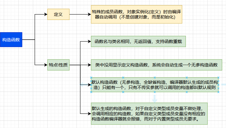 1. 函数名与类名相同。 2. ⽆返回值。 (返回值啥都不需要给,也不需要写void,不要纠结,C++规定如此) 3. 对象实例化时系统会⾃动调⽤对应的构造函数。 4. 构造函数可以重载。