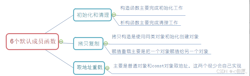 2 类的默认成员函数生成个数/分类:⼀个类,我们不写的情况下编译器会默认⽣成以下6个默认成员函数,【注意这是C++98的标准,后续C++11还会增加两个默认成员函数移动构造和移动赋值】