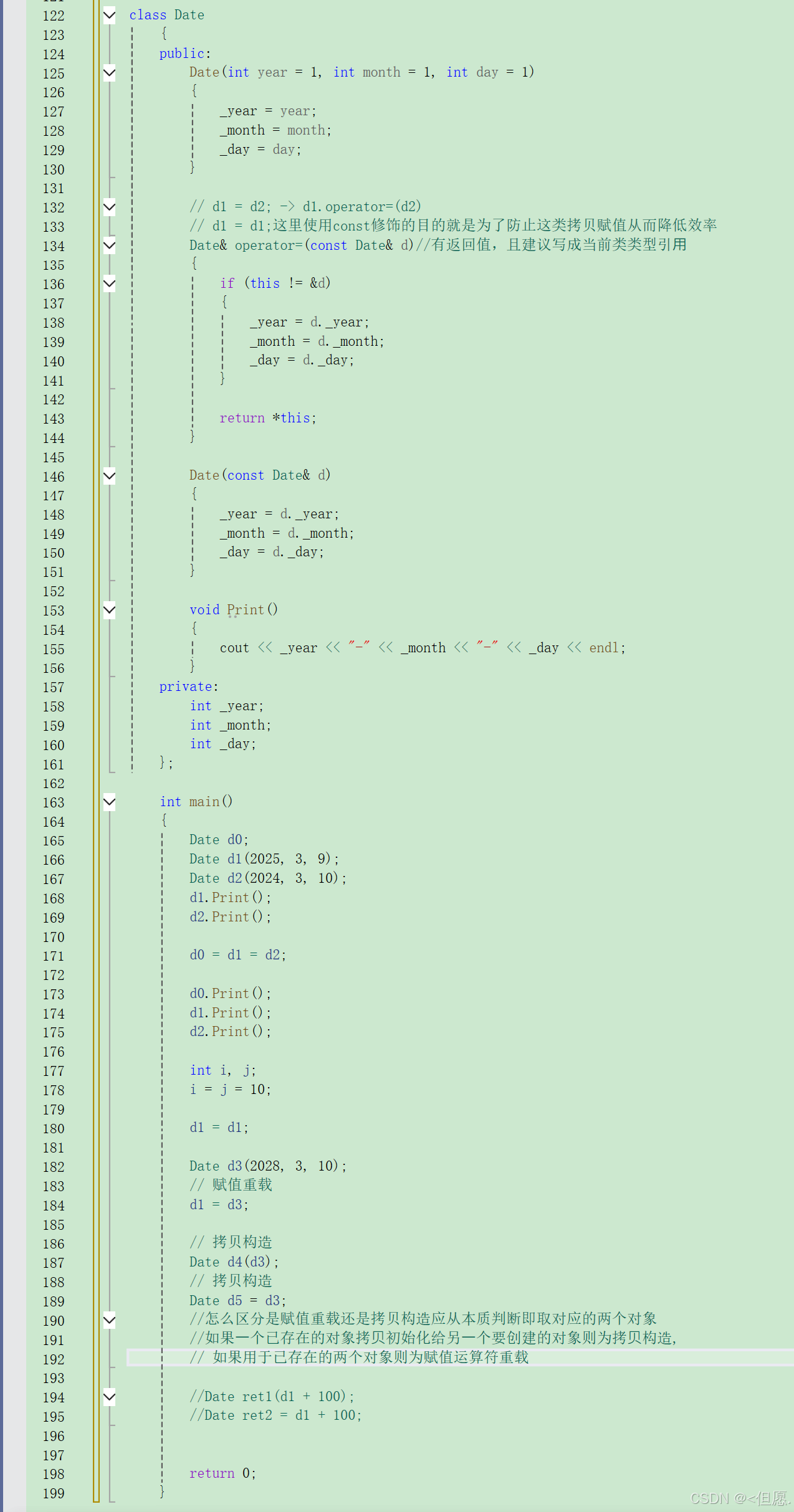 3.1定义:赋值运算符重载是⼀个默认成员函数,⽤于完成两个已经存在的对象直接的拷⻉赋值,这⾥要注意跟拷⻉构造区分,拷⻉构造⽤于⼀个对象拷⻉初始化给另⼀个要创建的对象,而赋值运算符重载用于已存在的两个对象。