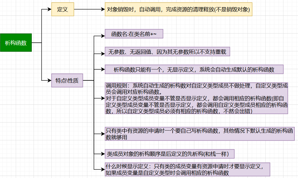 1. 跟构造函数类似,我们不写编译器⾃动⽣成的析构函数对内置类型成员不做处理,⾃定类型成员会调⽤他的析构函数。 2. 还需要注意的是我们显⽰写析构函数,对于⾃定义类型成员也会调⽤他的析构,也就是说⾃定义类型成员⽆论什么情况都会⾃动调⽤析构函数。 3. 如果类中没有申请资源时,析构函数可以不写,直接使⽤编译器⽣成的默认析构函数,如果默认⽣成的析构就可以⽤【满足需求】,此时就不需要显⽰写析构,但是有资源申请时,⼀定要⾃⼰写析构,否则会造成资源泄漏。 4. ⼀个局部域的多个对象,C++规定后定义的先析构。