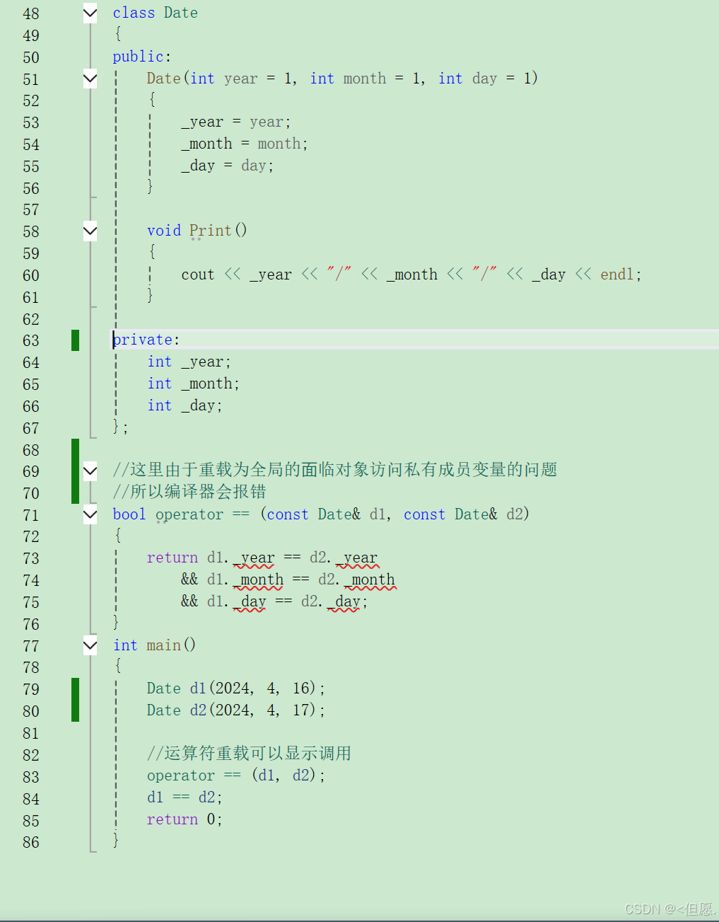 • 当运算符被⽤于类类型的对象时,C++语⾔允许我们通过运算符重载的形式指定新的含义。C++规定类类型对象使⽤运算符时,必须转换成调⽤对应运算符重载,若没有对应的运算符重载,则会编译报错。【对于基本类型(内置类型)使用运算符的本质是生成相应的指令,而自定义类型是没有相应的指令,所以编译器都不知道自定义类型的存在,例如日期类在比较大小时使用运算符是会编译报错的】 •运算符重载是具有特殊名字的函数,他的名字是由operator和后⾯要定义的运算符共同构成。和其他函数⼀样,它也具有其返回类型和参数列表以及函数体。【返回值的类型是根据返回对应项的意义】 •重载运算符函数的参数个数和该运算符作⽤的运算对象数量⼀样多。⼀元运算符有⼀个参数,⼆元运算符有两个参数,⼆元运算符的左侧运算对象传给第⼀个参数,右侧运算对象传给第⼆个参数。【 注意因为有些运算符的操作数的顺序相反的结果是不相同的,所以我们使用运算符重载时应注意其参数顺序应和运算符的操作数的顺序相同 •如果⼀个重载运算符函数是成员函数,则它的第⼀个运算对象默认传给隐式的this指针,因此运算符重载作为成员函数时,参数⽐运算对象少⼀个。 • 运算符重载以后,其优先级和结合性与对应的内置类型运算符保持⼀致。 •不能通过连接语法中没有的符号来创建新的操作符:⽐如operator@。 • .* :: sizeof ?: . 注意以上5个运算符不能重载。 • 重载操作符⾄少有⼀个类类型参数,不能通过运算符重载改变内置类型对象的含义,如: int operator+(int x, int y) •⼀个类需要重载哪些运算符,是看哪些运算符重载后有意义,⽐日期类重载operator-就有意义,但是重载operator*就没有意义。 •重载++运算符时,有前置++和后置++,运算符重载函数名都是operator++,⽆法很好的区分。C++规定,后置++重载时,增加⼀个int形参,跟前置++构成函数重载,⽅便区分。 •重载<<和>>时,需要重载为全局函数,因为重载为成员函数,this指针默认抢占了第⼀个形参位置,第⼀个形参位置是左侧运算对象,调⽤时就变成了 对象<<cout,不符合使⽤习惯和可读性。重载为全局函数把ostream/istream放到第⼀个形参位置就可以了,第⼆个形参位置当类类型对象。