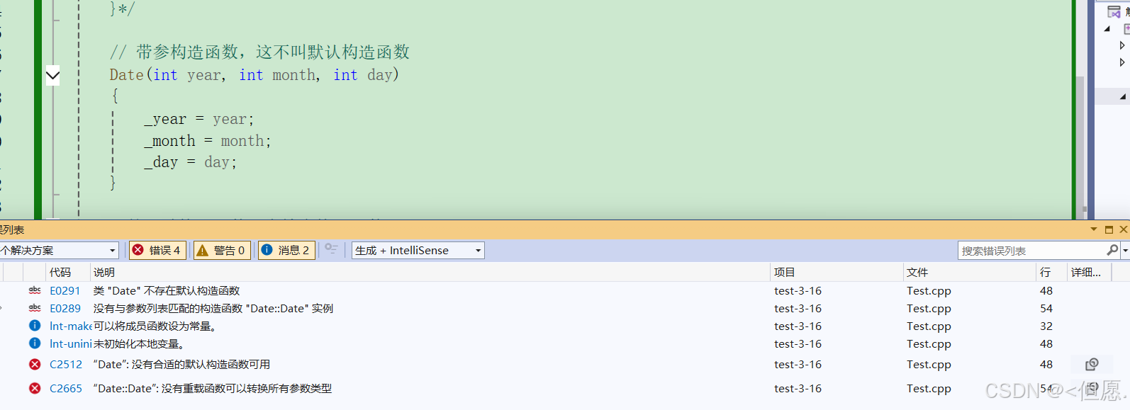 报的错是没有相匹配的构造函数,因为我们已经自己写了构造函数,此时编译器就不会在自动生成默认构造函数