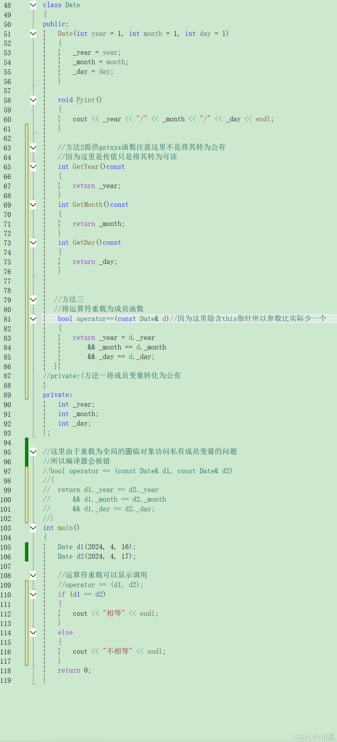 重载为全局的⾯临对象访问私有成员变量的问题 有⼏种⽅法可以解决: 1、成员放公有 2、提供getxxx函数 3、友元函数 4、重载为成员函数