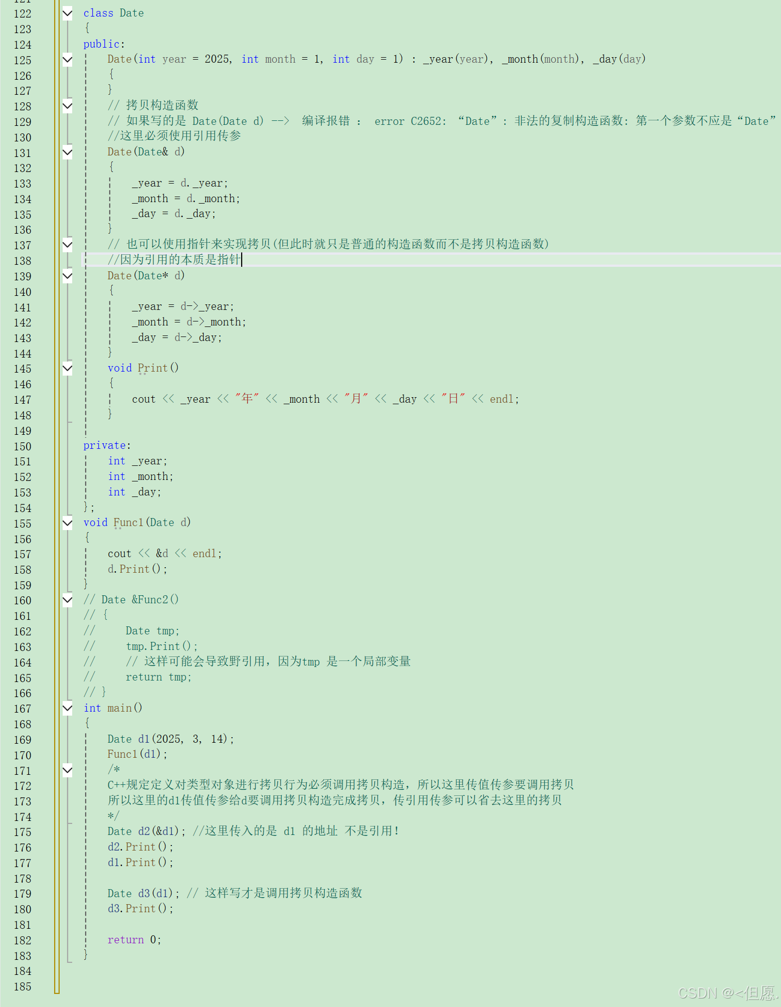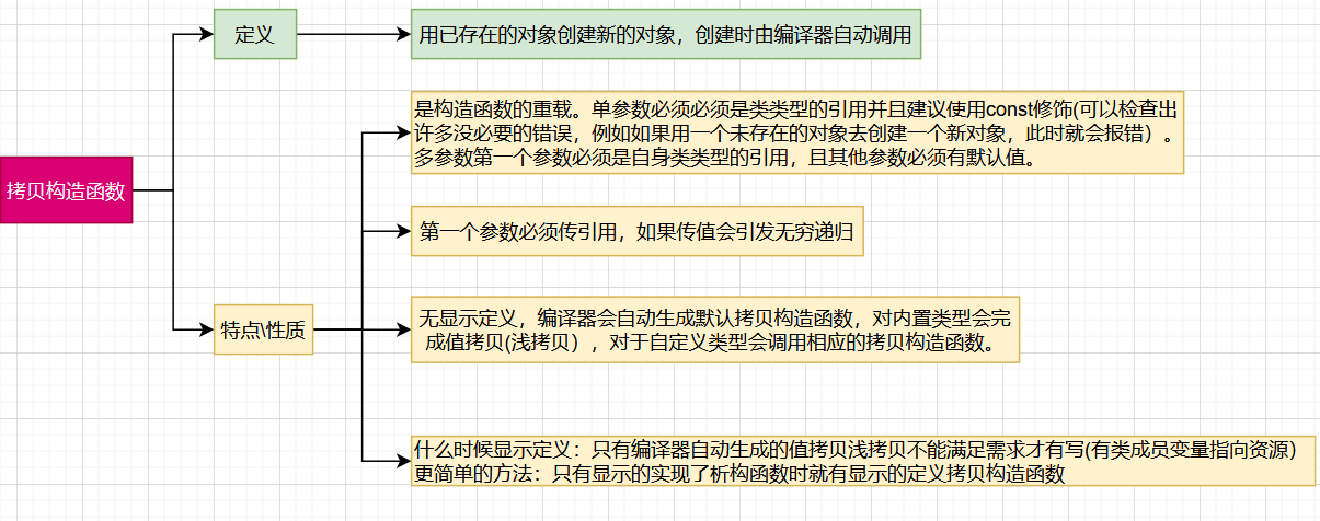 1. 拷⻉构造函数是构造函数的⼀个重载。 2. 拷⻉构造函数的第⼀个参数必须是类类型对象的引⽤,使⽤传值⽅式编译器直接报错,因为语法逻辑上会引发⽆穷递归调⽤。 拷⻉构造函数也可以多个参数,但是第⼀个参数必须是类类型对象的引⽤,后⾯的参数必须有缺省值。【因为要保证除第⼀个参数以外任何额外的参数都有默认值】 3. C++规定⾃定义类型对象进⾏拷⻉⾏为必须调⽤拷⻉构造,所以这⾥⾃定义类型传值传参和传值返回都会调⽤拷⻉构造完成。 4. 若未显式定义拷⻉构造,编译器会⽣成⾃动⽣成拷⻉构造函数。⾃动⽣成的拷⻉构造对内置类型成员变量会完成值拷⻉/浅拷⻉(⼀个字节⼀个字节的拷⻉),对⾃定义类型成员变量会调⽤他的拷⻉构造。 5. 对于什么时候要自己实现拷⻉构造函数:这⾥有⼀个⼩技巧,如果⼀个类显⽰实现了析构并释放资源,那么他就需要显⽰写拷⻉构造,否则就不需要。 6. 传值返回会产⽣⼀个临时对象调⽤拷⻉构造,传值引⽤返回,返回的是返回对象的别名(引⽤),没有产⽣拷⻉。但是如果返回对象是⼀个当前函数局部域的局部对象,函数结束就销毁了,那么使⽤引⽤返回是有问题的,这时的引⽤相当于⼀个野引⽤,类似⼀个野指针⼀样。传引⽤返回可以减少拷⻉,但是⼀定要确保返回对象,在当前函数结束后还在,才能⽤引⽤返回。