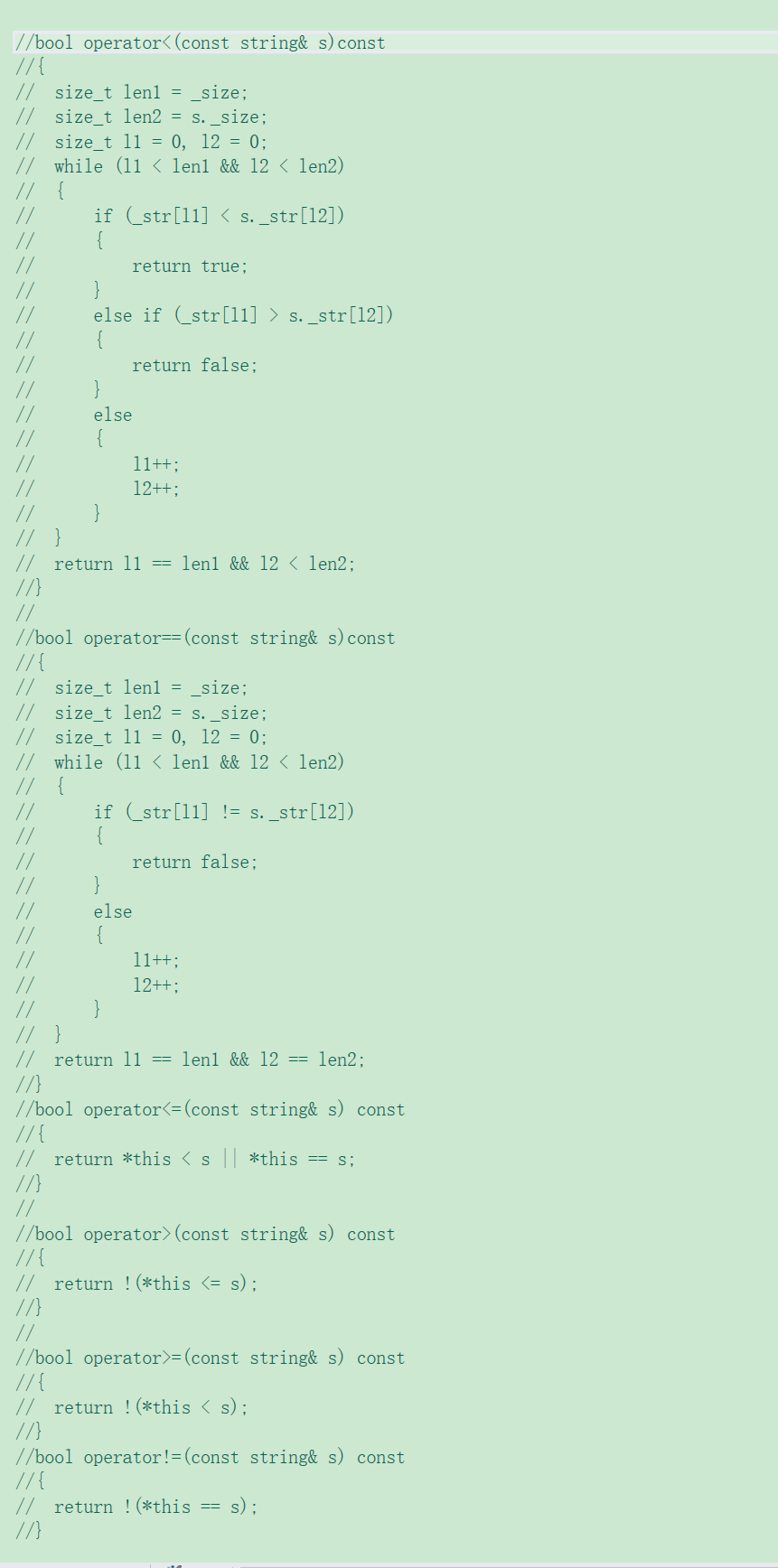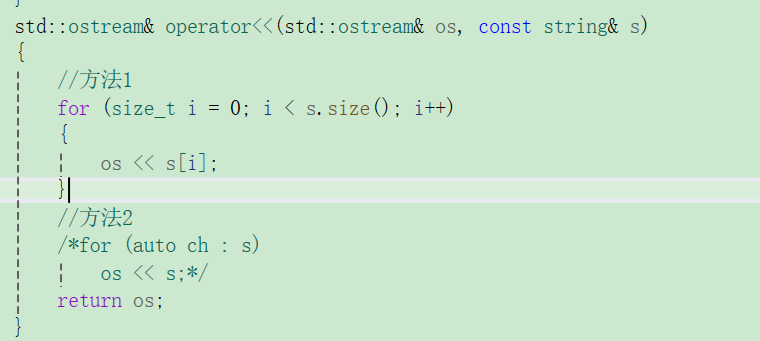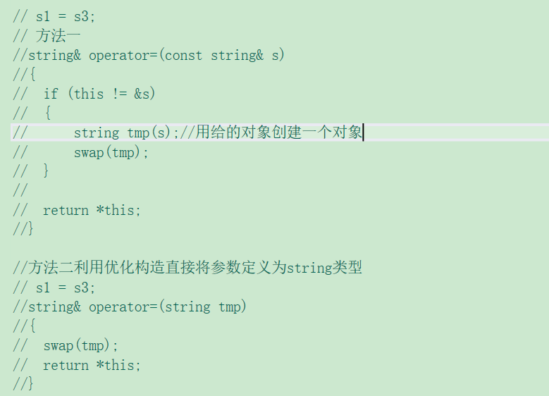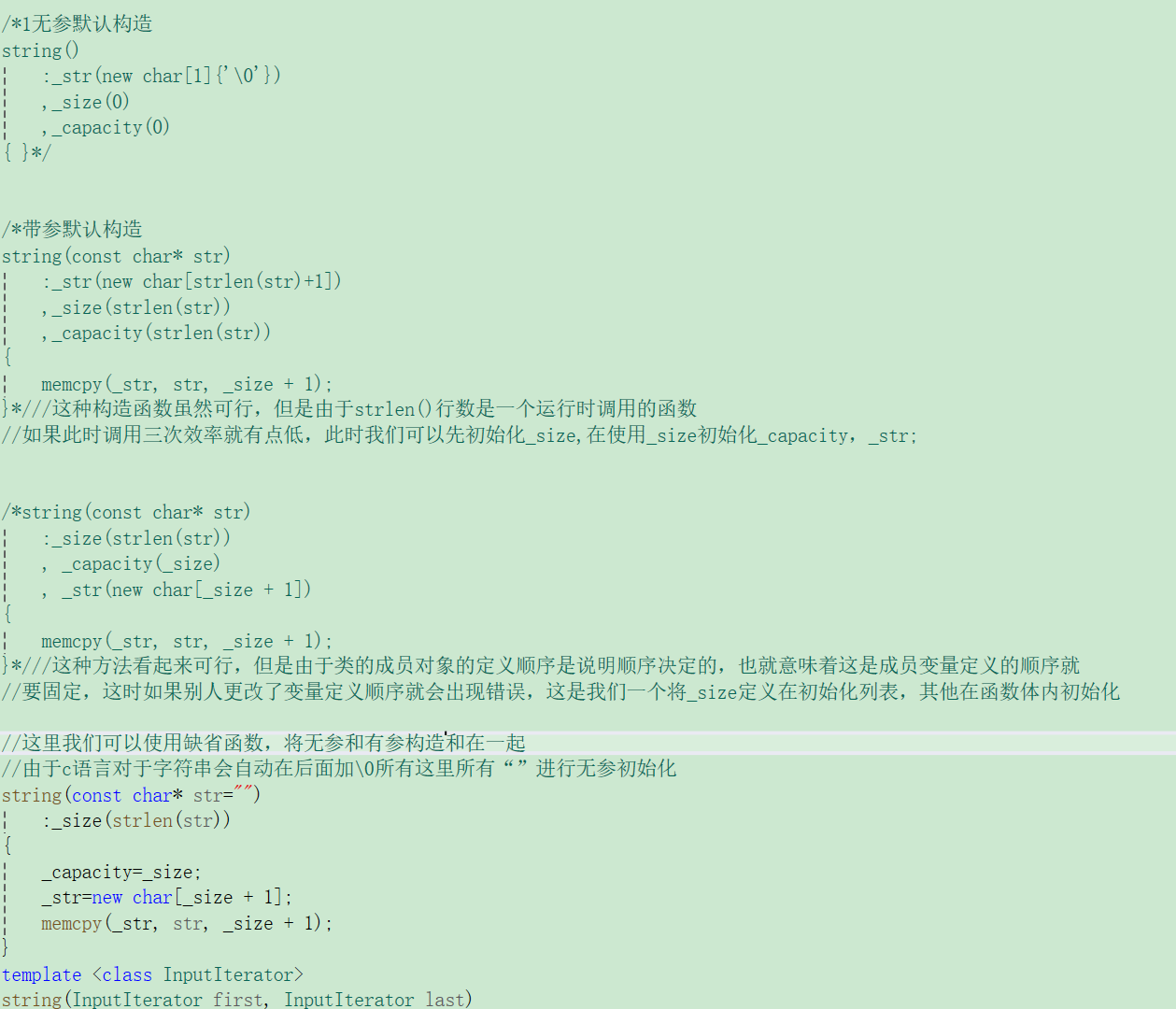 (2)顺序问题:这里如果我们三次使用strlen()函数,由于该函数是一个运行时才调用的函数,如果调用三次效率就不高,这时候就有人认为先初始化_size,在使用_size来初始化其他成员变量,但是成员变量初始化顺序是由声明是确定的,这时我们可以最先声明_size(这是一个解决方法,但是这也引出一个问题就是成员变量声明顺序是确定的[被捆绑],此时如果有一个改变了成员变量声明顺序就会引发一系列问题)显然这种方法有不行,最优解决方法是_size在初始化列表初始化,其他成员变量用已初始化的_size在函数体内初始化。