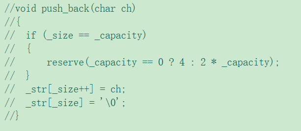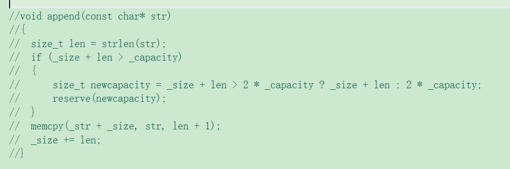 注意扩容问题,这里不像前面push_back()一样空间满了扩2倍就行,由于2倍原空间容量与原空间容量+要插入的常量字符串长度的大小关系未知,所以这里可以使用三目操作符来决定是扩到2倍的原空间容量大小,还是扩大到原空间容量+要插入的常量字符串长度。这里用memcpy()函数就不用管标识符'\0‘的问题了该函数会将标识符'\0‘复制过去。