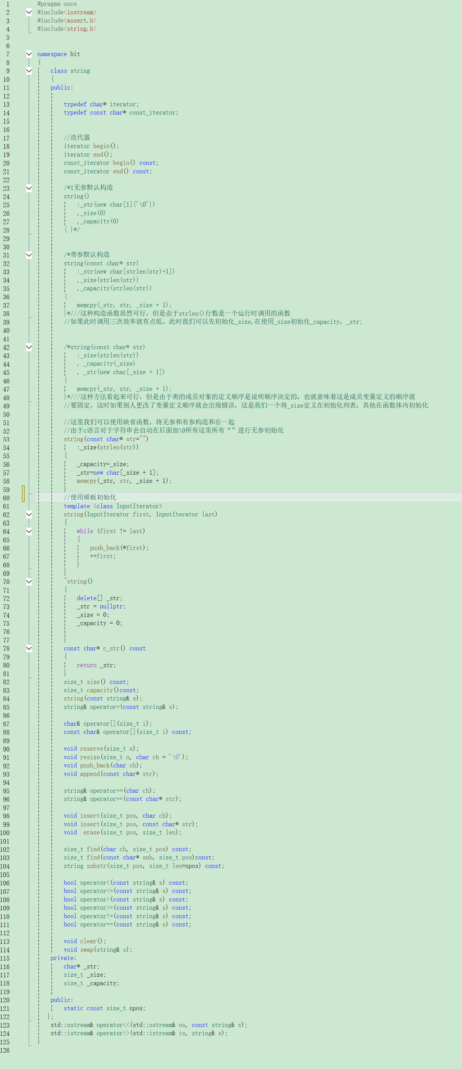 由于string底层是一个char类型的顺序表,接下来给出的接口都是基于以下框架: