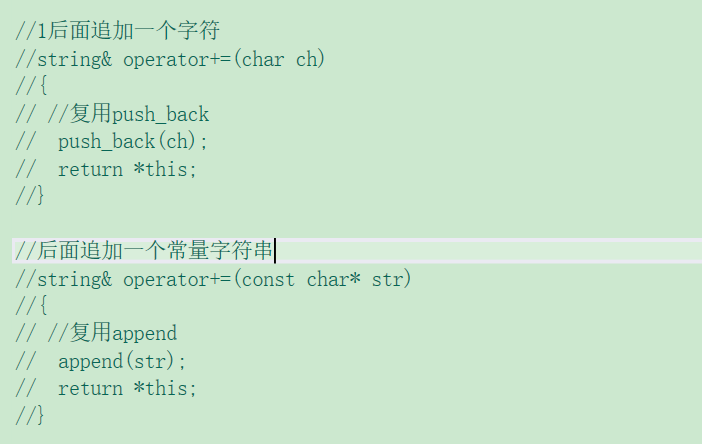 分为两种(1)追加一个字符,(2)追加一个常量字符串。其实我们已经实现了相关效果两种效果分别对应push_back和append,这里我们直接复用两个函数即可。
