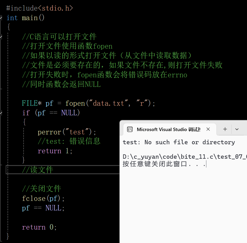 最后pf==NULL,防止其成为野指针。 创建了该文件就不会报错了。