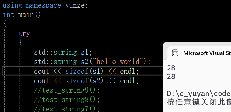 s2后给的字符串不是存到string对象本身的空间上面的,而是存在该对象指向的堆空间上,所以这里s1对象和s2对象的大小是没有任何区别的。根据其成员变量,理论上在 32 位系统中,char* 和size_t占 4 字节,总大小为 4 + 4 + 4 = 12字节,在 64 位系统中,char* 占 8 字节,size_t占 8 字节,因此总大小为 8(_str) + 8(_size) + 8(_capacity) = 24字节。 然而实际在32位系统下,这里的大小是28字节