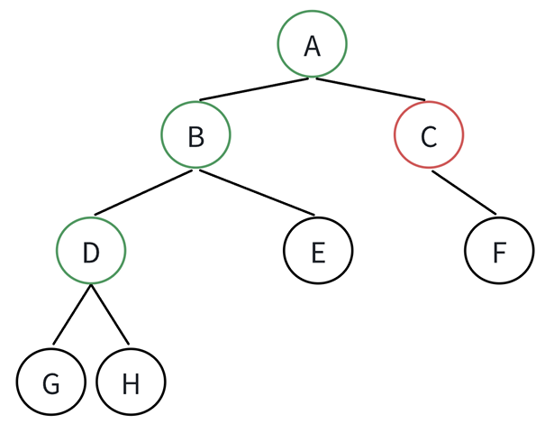 此时F这棵二叉树的左右子树构建完成,在F的函数栈帧中return root,回到D的函数栈帧,D return root回到B,B回到A,A的根左已经构建完了,开始构建A的右子树,A的右子树取到的是#,i直接++,此时二叉树构建完成
