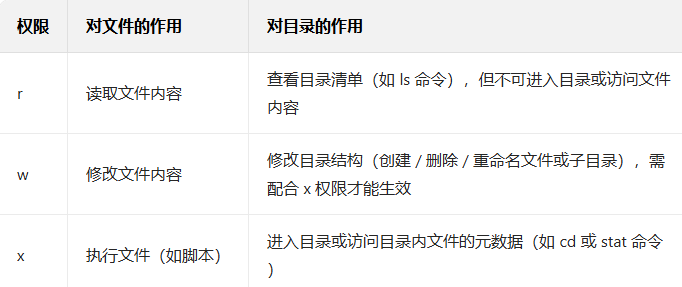 在linux中,w和r权限对于目录的含义与普通文件完全不同,要理解目录的权限,首先要理解目录,目录在Linux中是一种特殊文件,存储了其包含的文件/子目录的名称和inode指针。因此,权限控制的是对这份“目录清单”的操作能力。