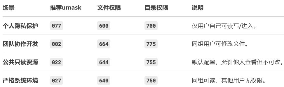 sudo nano /etc/bashrc # 或修改其他全局配置文件以下是适应不同场景的umask设置推荐