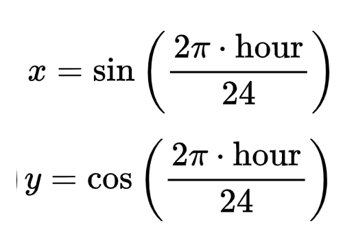 2 * π * hour / 24:先把小时数值转化成弧度角度。在这个体系下,午夜和晚上 11 点的角度非常接近,通过 sin 和 cos 将角度投影到两个坐标轴上。