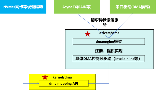 但不同厂商(如Intel、ARM)的 DMA 控制器寄存器布局、传输模式差异显著,驱动适配工作量大;不同外设驱动的 DMA 事务管理逻辑(如队列调度、中断处理)高度相似,存在大量重复代码。