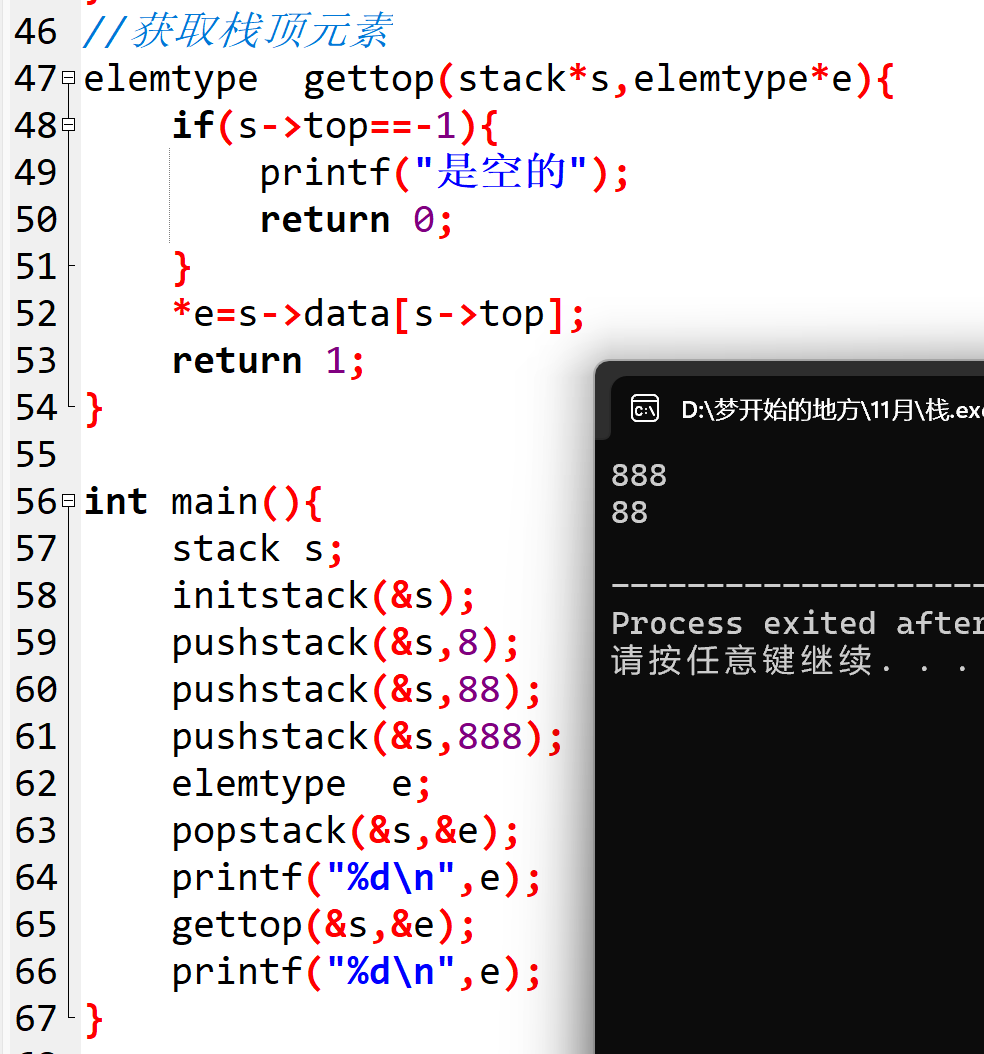 比如上面出栈888后,用这个函数就能获取到当前栈顶88,而栈的结构不会发生变化。