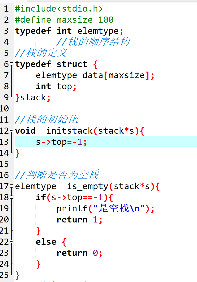 为了避免操作空栈,我们需要一个函数来判断栈是否为空,本质就是检查top是否等于-1。