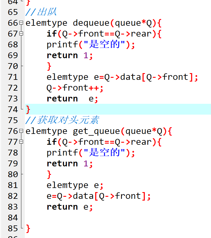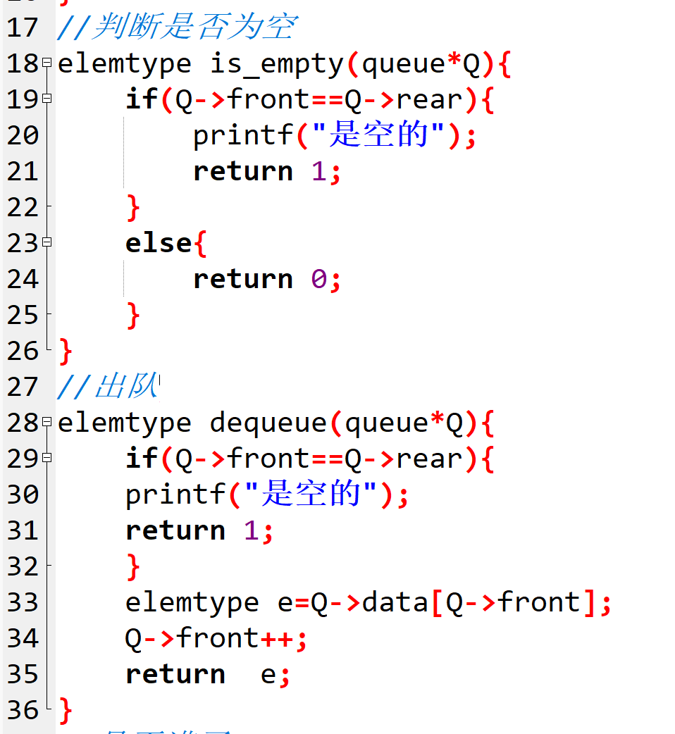 判断队列是否为空的标准很简单:当 front == rear 时,说明队列中没有元素。这里需要注意代码的小细节 —— 函数返回值设计为 elemtype(本质是 int),返回 1 表示空,0 表示非空,同时增加打印提示,提升调试友好性: