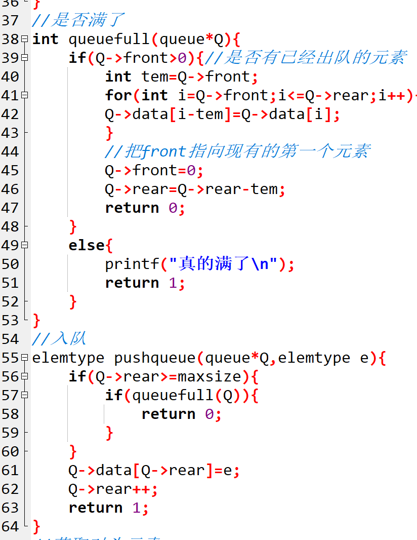 if(queuefull(Q)){ // 尝试搬移空间,若真满则返回0