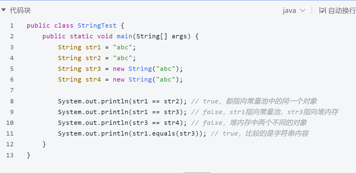 这里要注意:==运算符比较的是对象的引用地址,而String类重写了equals方法,比较的是字符串的实际内容。因此,在比较字符串内容时,一定要使用equals方法,而不是==。