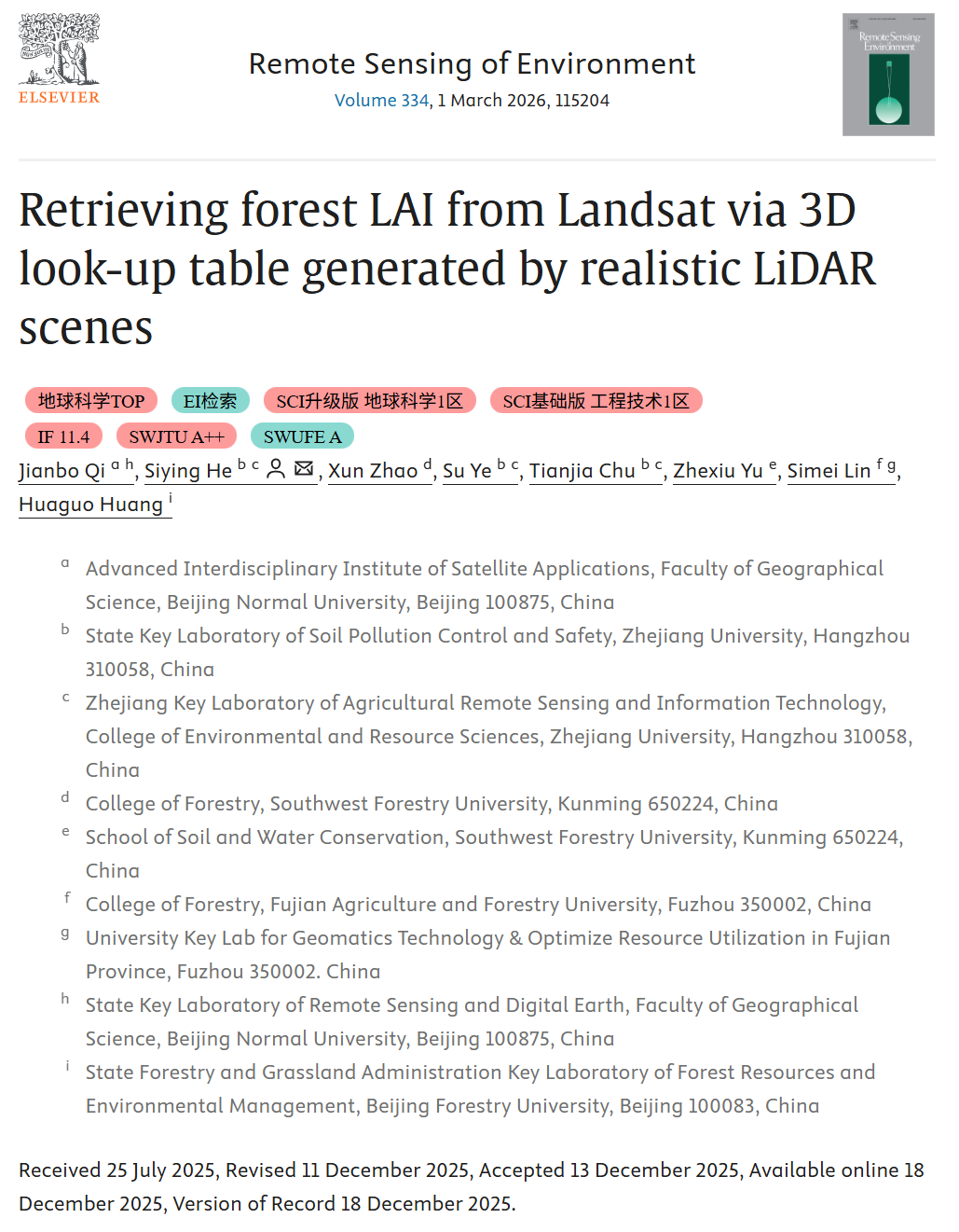 叶面积指数(Leaf Area Index, LAI)作为描述森林植被结构的关键生物物理参数,是评估森林生态系统功能和健康的重要指标。LAI与植被的各种重要生物和生理过程(如光合作用、蒸腾作用以及养分、碳和水的循环)密切相关,并直接影响森林生态系统与周围环境之间的物质和能量交换。
