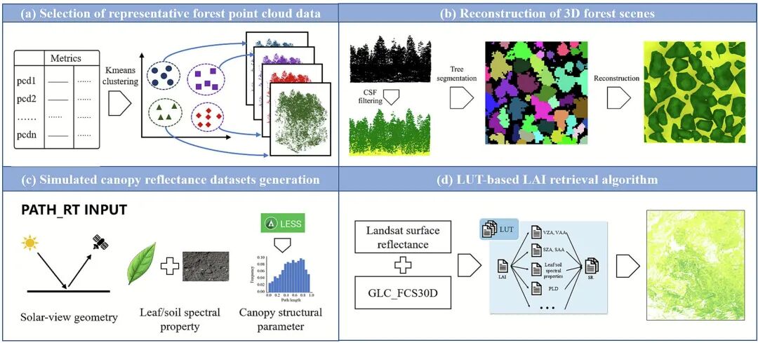 本研究提出了一种新颖的三维查找表(3D-LUT)方法,通过整合机载LiDAR数据来参数化辐射传输模型,从而显著提升LAI反演精度。其技术路线主要包括四个关键步骤。