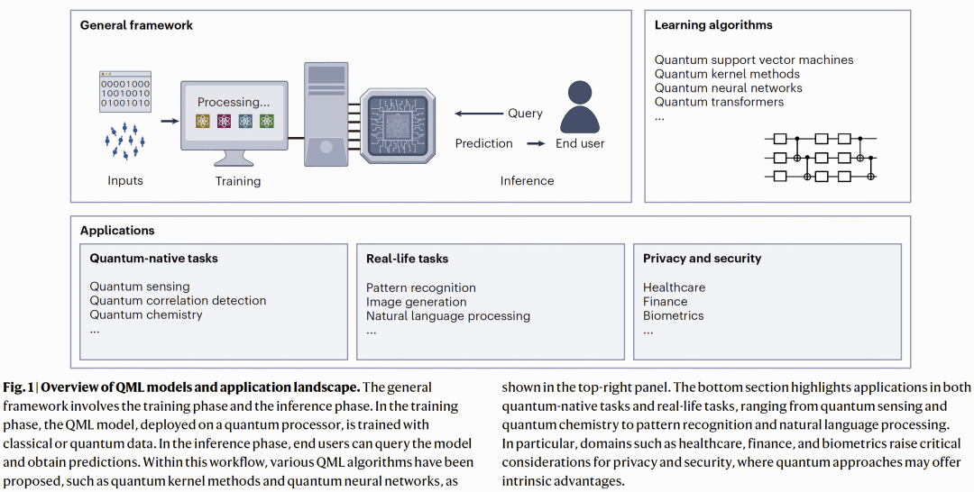 QML 的核心理念在于:量子计算机能够以本质上不同于经典系统的方式处理信息,从而为数据表示、变换与推断提供新的可能性(图 1)。早期的量子学习模型探索主要通过将经典学习范式引入量子框架,为这一领域奠定了基础。