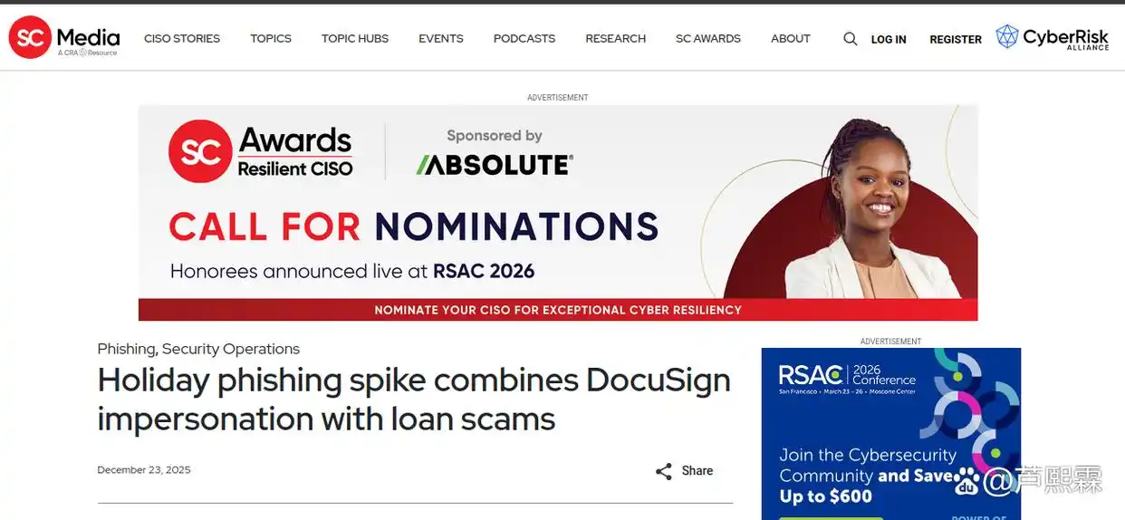 2025年假期季,攻击者进一步将DocuSign伪装与金融诈骗融合。据观察,攻击邮件通常包含以下要素:(1)主题行使用紧迫性语言,如“紧急:您的$15,000贷款已批准,请24小时内签署”;(2)正文模仿DocuSign标准模板,包含公司Logo、灰色导航栏、文档预览缩略图;(3)行动按钮使用官方配色(蓝色底白字);(4)发件人地址经过SPF/DKIM部分伪造,使其在邮件客户端显示为“via docusign.net”(实际由第三方邮件服务中继);(5)嵌入链接使用短网址服务(如bit.ly)或动态生成的一次性域名,规避静态URL黑名单。