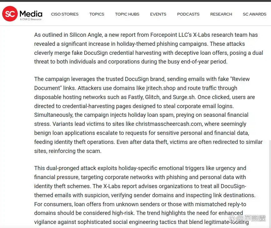 本文系统分析了假期期间出现的DocuSign伪装与虚假贷款诈骗融合式网络钓鱼攻击。研究表明,该攻击通过精心设计的社会工程话术与轻量级技术工具,构建了从邮件投递到信息窃取的完整闭环。其成功不仅依赖于前端仿冒的真实性,更根植于对用户节日财务焦虑的精准利用。防御此类攻击需超越传统签名匹配,转向结合邮件上下文分析、URL结构验证、宏行为监控与用户意识提升的多维策略。未来工作可探索基于大语言模型的邮件语义异常检测,以及跨平台凭证泄露实时预警机制,以应对日益智能化的钓鱼威胁。