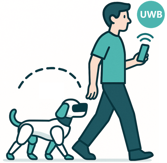 在实际应用中,若要构建高稳定性、多场景适配的智能伴随系统,UWB 技术成为关键支撑。作为无线电定位领域公认的最高精度技术,UWB 的应用方式极为便捷:主人仅需随身携带一枚轻巧的 UWB 标签(如苹果AirTag防丢器、汽车钥匙的大小),或直接使用支持UWB功能的手机、手表;同时在机器人本体安装UWB定位锚点,机器人即可通过 UWB 信号实时捕捉主人位置,实现精准、稳定的智能伴随。